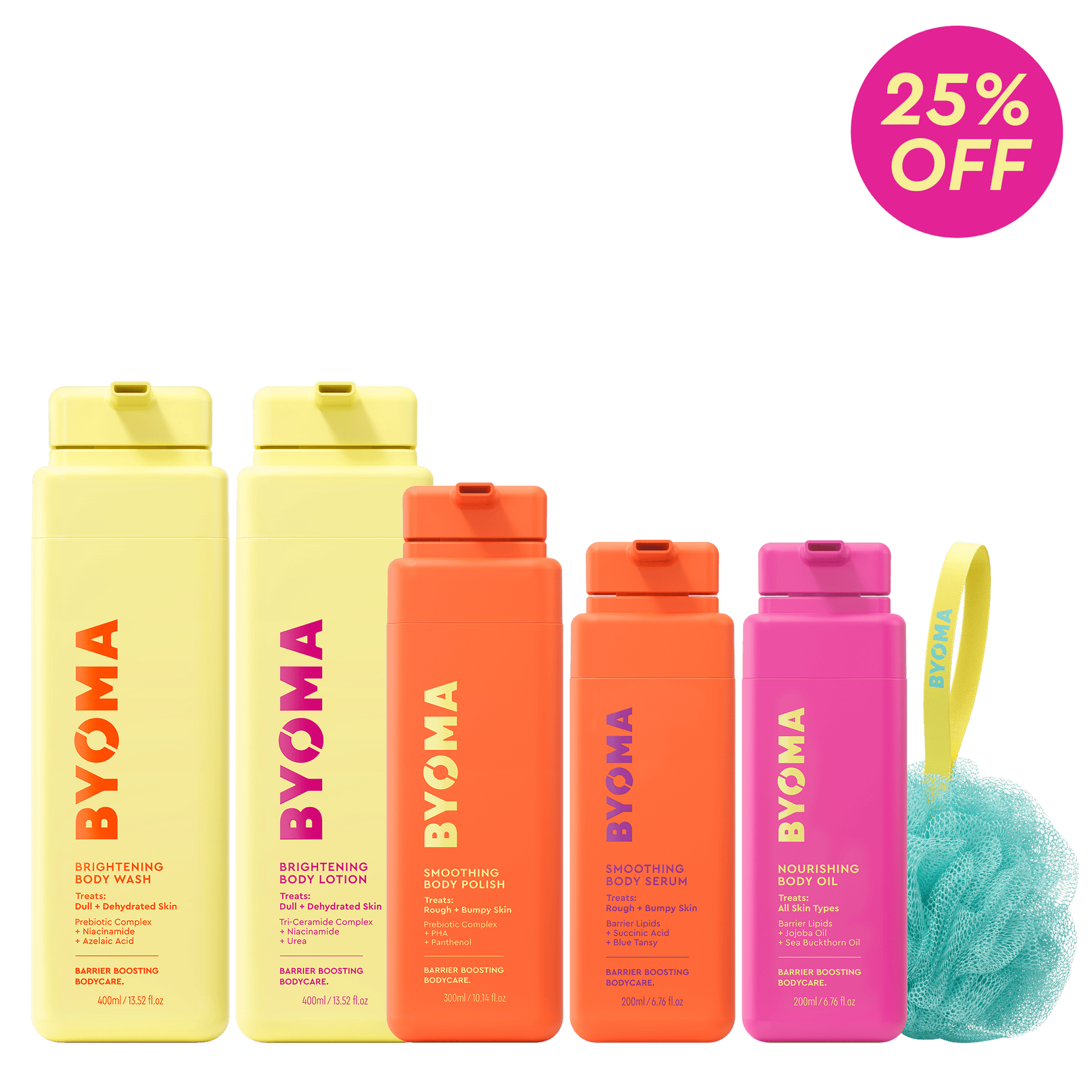 Meet your ultimate body care routine for clinically proven brighter skin & your favourite BYOMA barrier boosting benefits, below the neck.