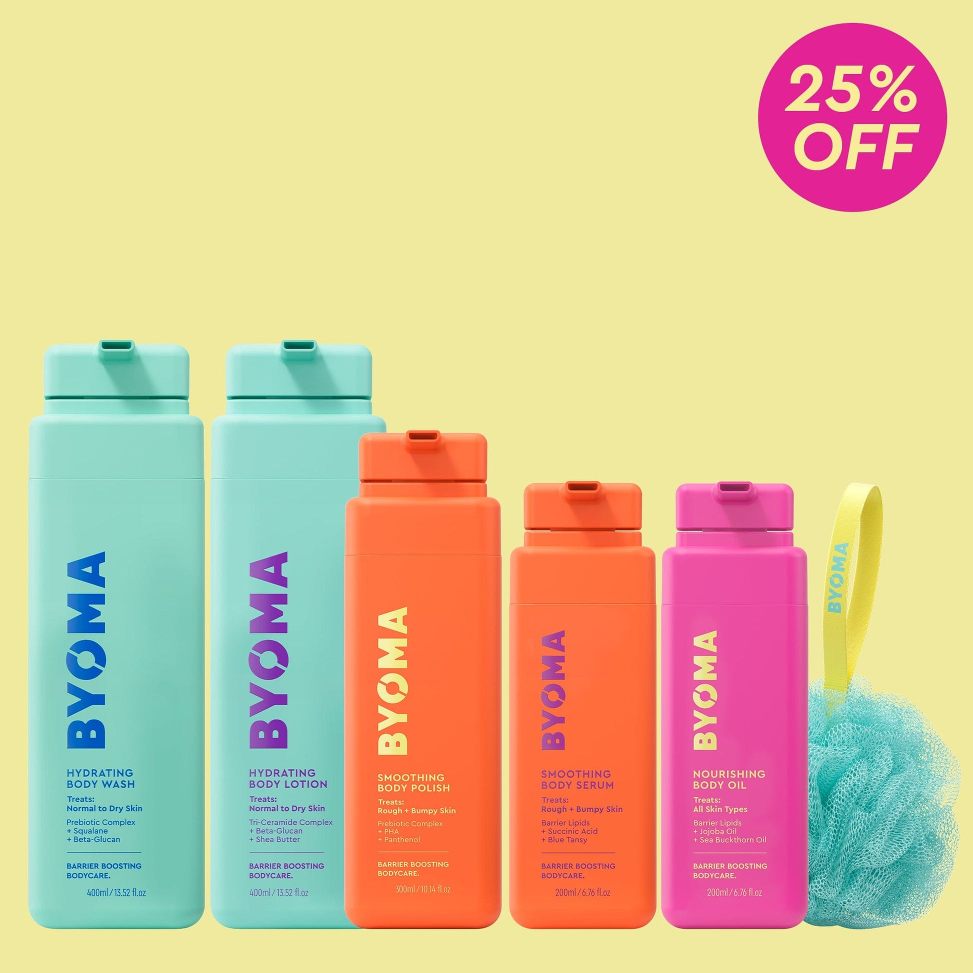 Meet your ultimate body care routine for smoother skin clinically proven hydration & your favourite BYOMA barrier boosting benefits, below the neck